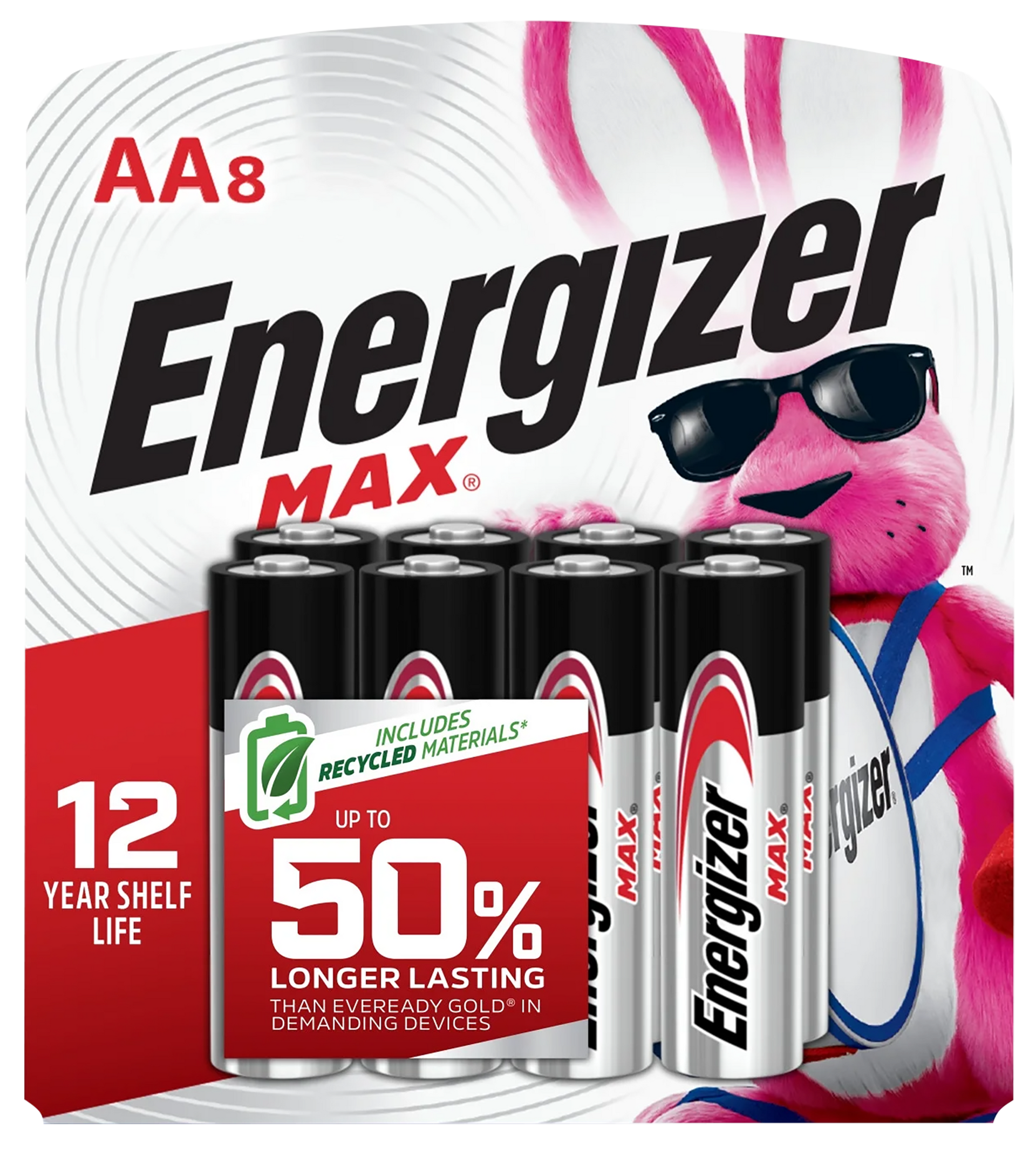 Energizer max aa batteries are not only long-lasting aa batteries they are complete with leak resistance and performance in extreme temperatures.Holds power for up to 10 years in storage.No added mercury or cadmium.Rechargeable: NoNominal Voltage: 1.5VAnsi Neda: 15A/IEC-LR6Chemical Composition: Zinc-Manganese DioxideSize: AAQuantity: (8) 1 PKView more