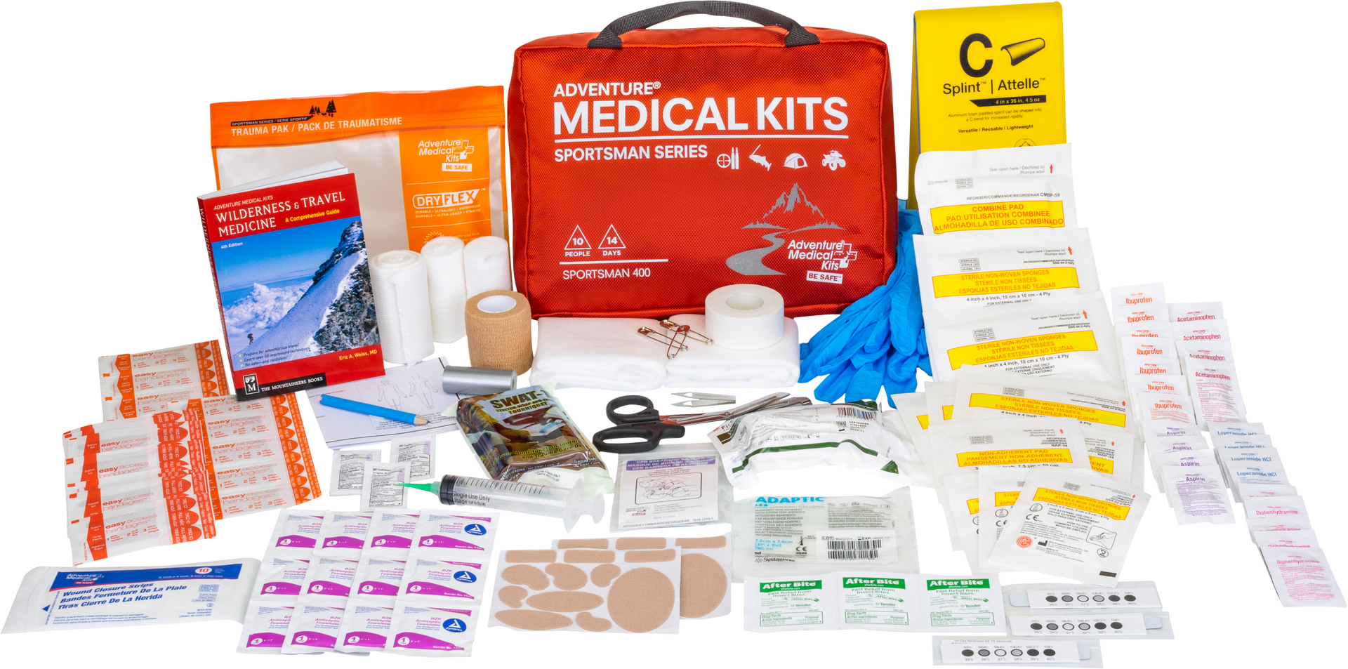 The sportsman 400 medical kit contains enough first aid supplies for ten people headed into the backcountry for up to two weeks.This wilderness first aid kit sets the standard in backcountry care with hospital-quality contents like a tourniquet, c-splint and woundstop trauma dressing for treating injuries and illnesses ranging from knife cuts to penetration wounds.The supplies are organized into injury-specific pockets using the easy care organization system and are listed on the external kit map so you can quickly find what you need in an emergency.For day trips away from base camp, leave the larger kit behind and pack the detachable, waterproof trauma kit for a lightweight addition to your hunting gear, snowmobile backpack, atv bag, fishing gear or archery equipment.