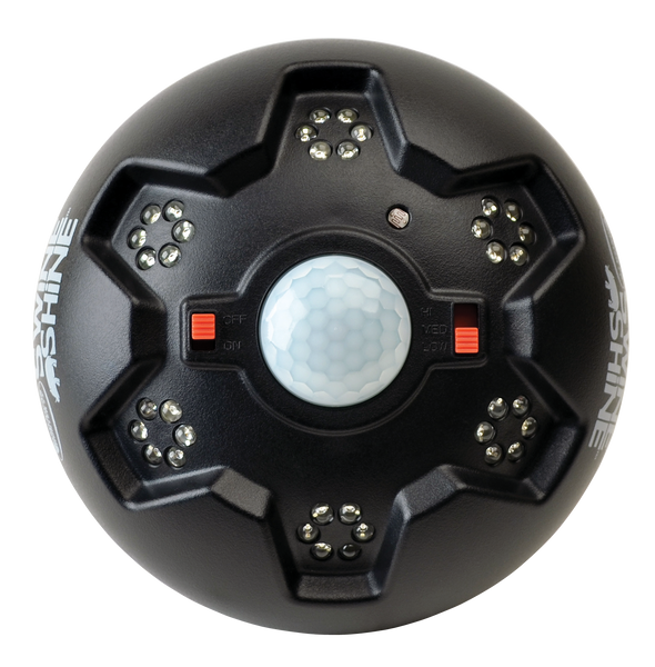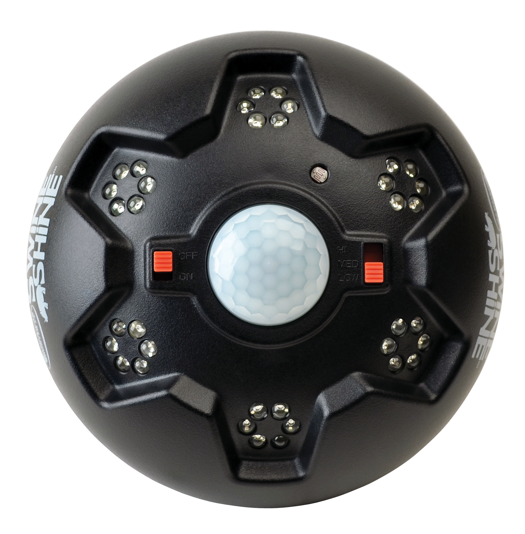 The swine shine hog light has a 360 degree pir motion sensor with fade on/off light activation.The cds light sensor has 36 green leds with 180 seconds of light per triggering.Degree's of light is high 100%, medium 60% and low 30% light power.Includes 4 mounting screws & nuts, universal mounting plate and 3m vhb all weather permanent mounting tape.Powered by 8 aa batteries.