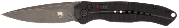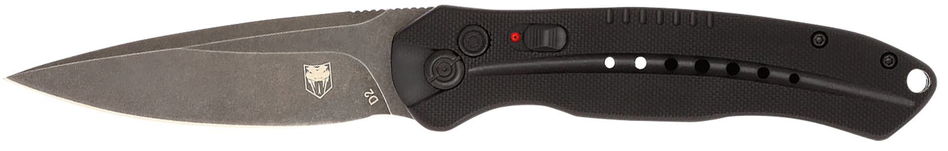 The diablo is a side button folding automatic.It comes equipped with g-10 scales and a black stonewash d2 steel blade.Has a sliding safety switch to prevent accidental discharge.