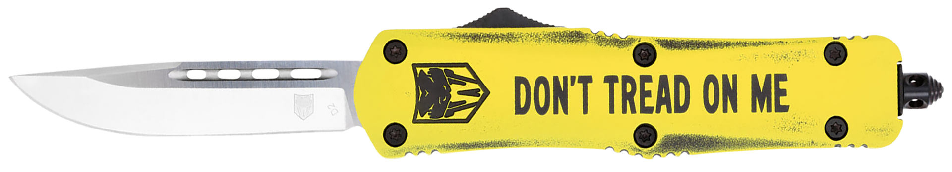 The medium don't tread on me is a dual action otf knife.Featuring a "don't tread on me" gadsden slogan laser engraved logo on one side and a "snake" symbol laser engraved logo on the reverse side, cerakoted aluminum alloy handle, top button trigger and is loaded with a high quality d2 steel blade.Includes a pocket clip, glass breaker for emergencies and nylon sheath.