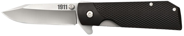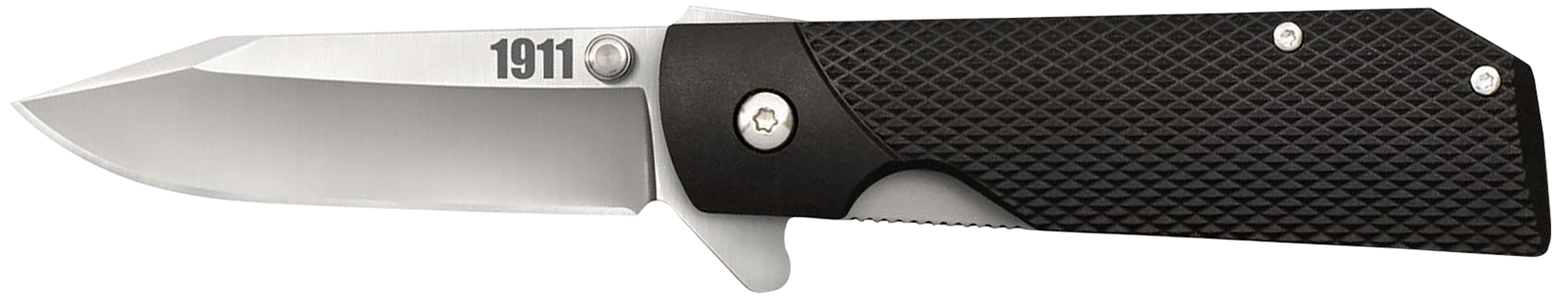 Designed to emulate the 1911s iconic grip frame, its lightning quick to draw and open thanks to its integral flipper and once deployed its super sharp, clip point blade can be made extra safe by engaging its patented secondary safety mechanism.Includes ambidextrous stainless steel pocket clip.Closed Length: 4"Blade Type: Clip PointBlade Length: 3"Oal: 7"Blade Material: 4034 SSHandle Description: Black TexturedWeight: 3.10 ozEdge Type: PlainOpen Type:...View more