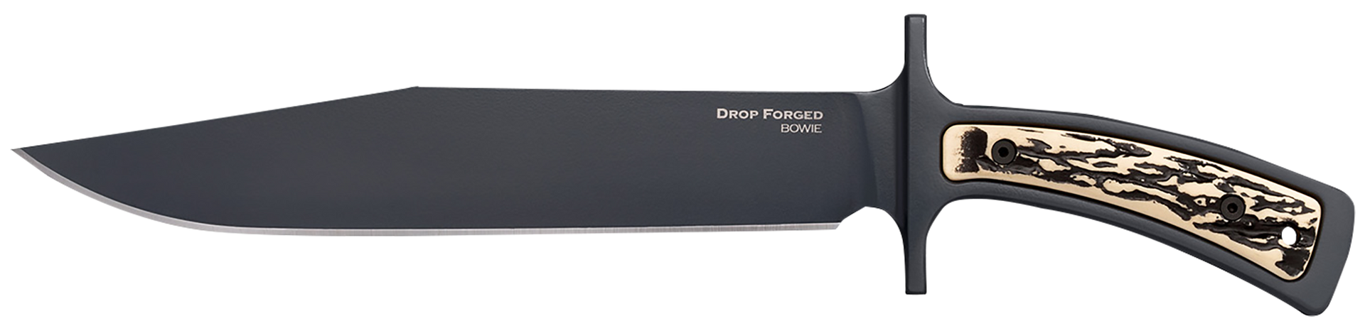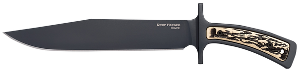 The drop forged bowie has total length of 14" and features a 9" blade, it shares many of the same attributes of the other knives in the series, including the same robust construction, being forged as a single piece of steel, giving it a startling amount of strength.It has distinctive faux stag slabs incorporated into the handle.The blade is flat ground to a moderately thin...View more