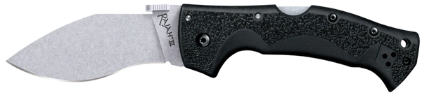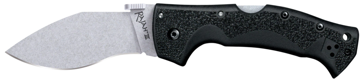 Designed by custom knife maker andrew demko, the cold steel rajah series has proven to be both fan favorites and instant classics.It's unique blade shape presents their thin, flat ground edges at just the right angle so they naturally bite deep, making cuts that way exceed other knives of the same size and weight.The rajah handle also shares similar aesthetic lines and design nuances with traditional kukris, with the addition of strategically placed curves for optimum grip and control.We've equipped the rajah series with our world renowned tri-ad locking mechanism.