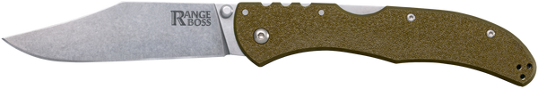 The range boss's clip point blade is flat ground to a thin edge that is so sharp it will astonish you.It is stone washed to resist rust and its versatility makes it a good skinning knife.The glass reinforced nylon handle is textured with a stippled pattern for a good grip and it features tri-ad lock for superlative strength.A natural for farm ranch or shop use.