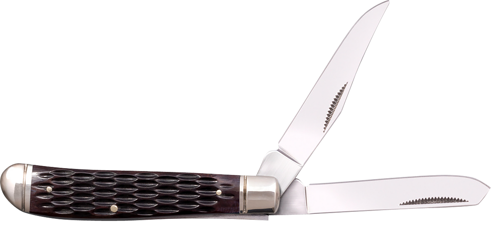 The cold steel trapper folding knife is cold steels variation on the classic slip joint trapper knife.It features handles with authentic bone and are highlighted with polished metal bolsters.The rugged handles are substantially sized for hard work, even with gloved hands.It is constructed in a traditional jack knife pattern, with two polished blades: a clip point blade for piercing and cutting and a spey blade for skinning and gutting.