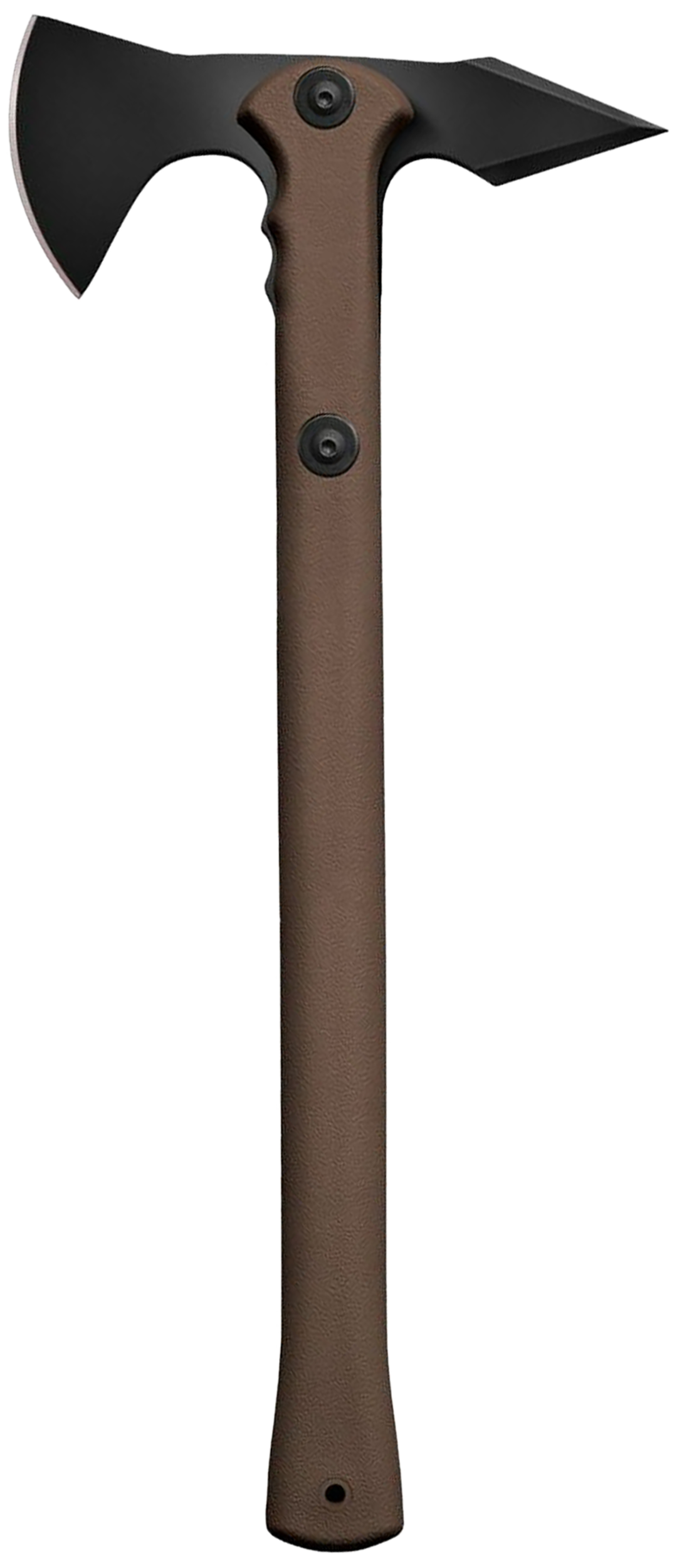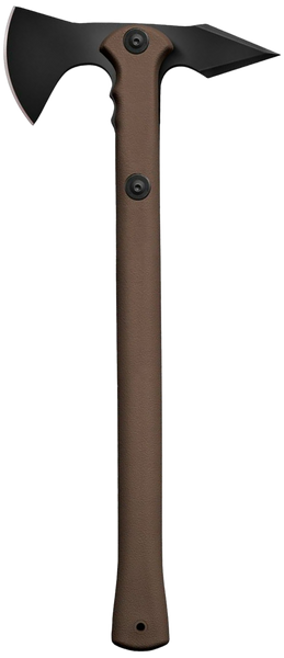 The cold steel trench hawk features a sharp cutting edge and wedge-style spike, offering numerous tactical options for the nations modern warriors.Drop forged from 1055 carbon steel and differentially hardened, the head of the trench hawk will withstand tremendous blows as well as the awful stress of prolonged hard use.The handle of the trench hawk is highly resistant to shock and will withstand abuse that would break even a tough hickory handle.As an added benefit, the handle is easily and cheaply replaced when worn out from repeated throwing.* the trench hawk comes complete with a patented articulated secure-ex sheath.