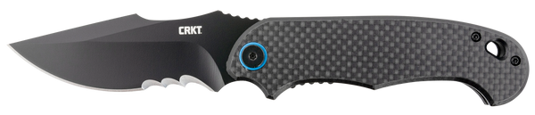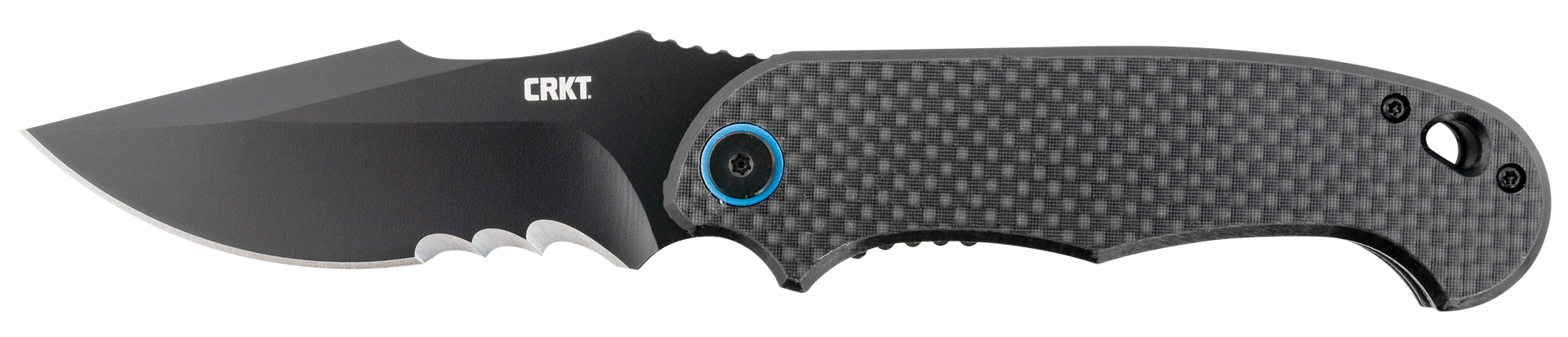 The p.S.D.Re-curve of the blade performs when making deep cuts and slicing, the veff serrations breezes through rope and cord, while the double grind makes pushing more efficient.The surprisingly compact g10 and carbon fiber handle accommodates a solid four-finger grip and is finished with an electric blue pivot and pocket clip.