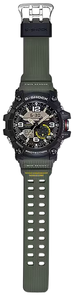 This is a twin sensor model from the g-shock mudmaster series, designed for use in extreme environments scattered with rubble, dirt and debris.With a push of one large button at the 3 o'clock position, you can check your position with its compass.The temperature can also be measured easily by pushing the button at 4 o'clock.This model has been developed with operability in mind so that anyone can intuitively check their position using the compass, even in the most extreme climates, without visual observation.The dust and mud-resistant button guard cylinder structure prevents fine sand and mud from getting into the buttons while also helping to absorb any shock to the buttons and improving operability.Broad hour/minute hands and indices of large arabic numerals have also been adopted to improve visibility.This design is packed with military-style flare, including a mode display that uses a sprocket-inspired disk dial and a textured band to prevent slipping.