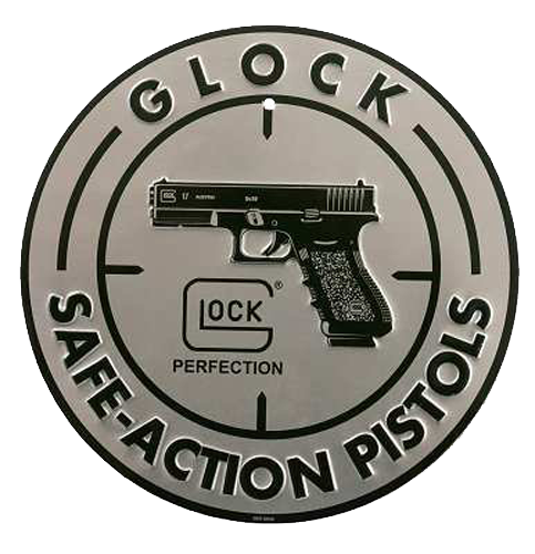 Glock's safe action aluminum sign is a great addition for any glock enthusiast.Description: Glock Promo SignGame: Safe ActionCall Type: Silver/BlackManual For: AluminumFormat: 12" DiameterView more