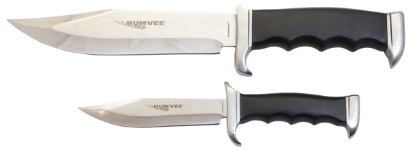 The humvee bowie knife combo set comes with two knives- a large and a small mirror polished, stainless steel with black pakawood handles.Includes nylon sheath.Type: BowieBlade Type: Spear PointBlade Length: 12.5"/8.5"Oal: 12.25"/8.50"Blade Material: Stainless SteelHandle Description: BlackWeight: 11.70 oz/4.90 ozSheath: NylonEdge Type: PlainOpen Type: N/AView more