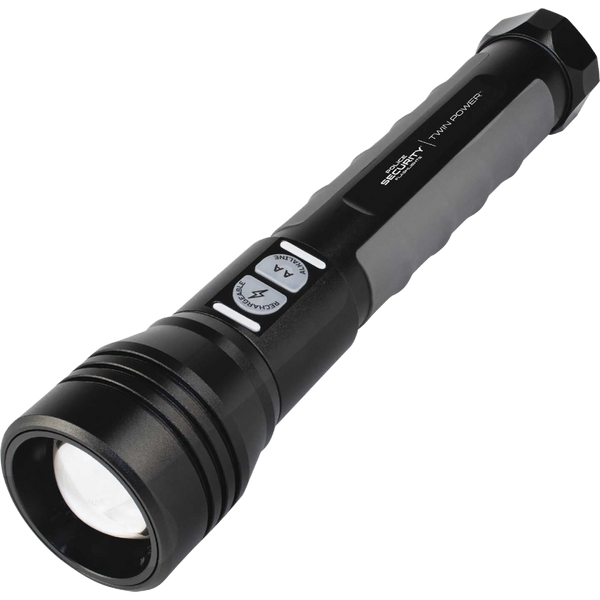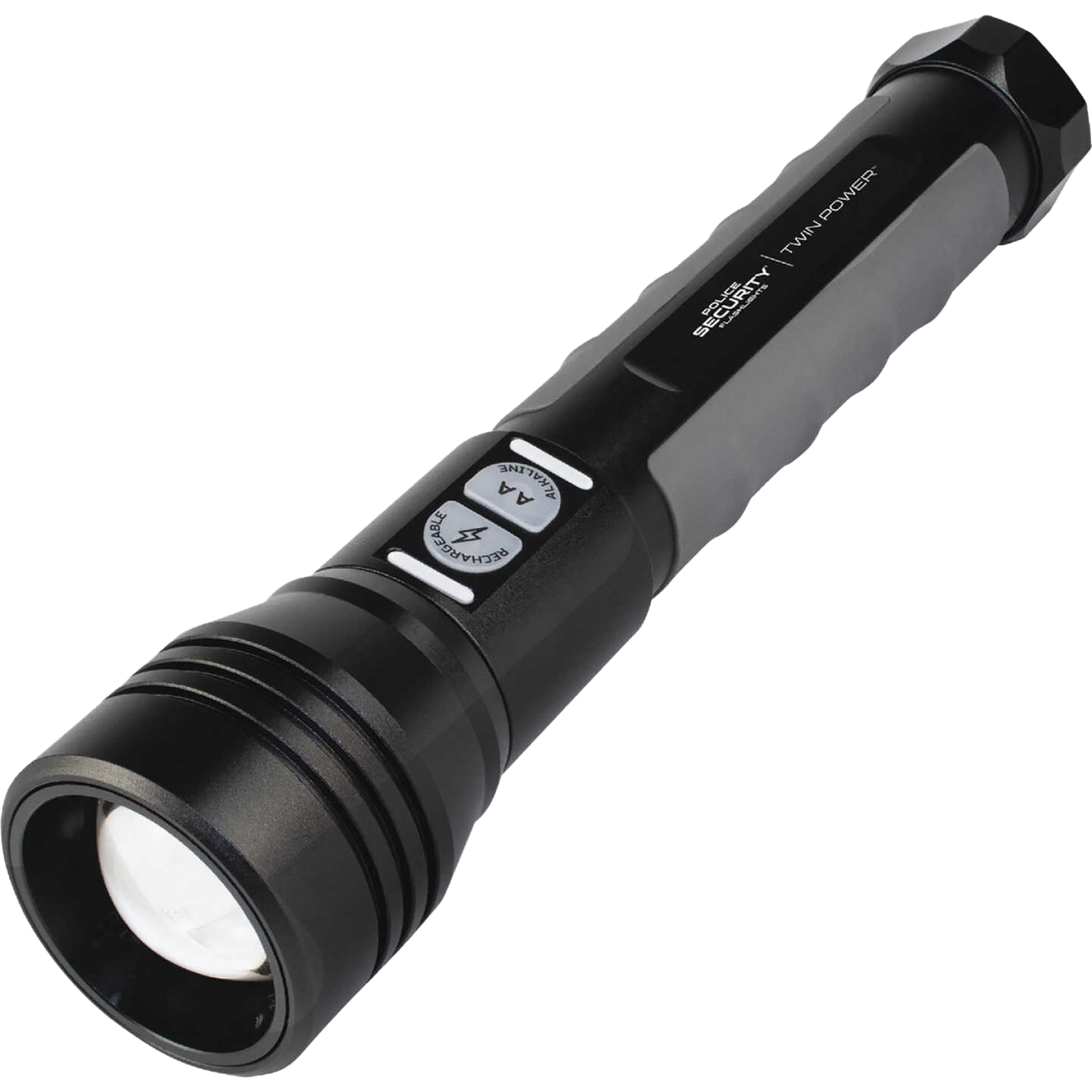 Police security's twin power flashlight is a groundbreaking, patent-pending, ultra-bright 2000 lumen flashlight that redefines traditional dual power flashlights.Unlike dual power, which requires two separate battery cartridges, the twin power flashlight operates seamlessly with a single cartridge.The cartridge holds a built-in 21700 rechargeable battery for primary power, and 3aa alkaline batteries for backup.With this innovative design, you'll never face the dilemma of drained power.Simply toggle...View more