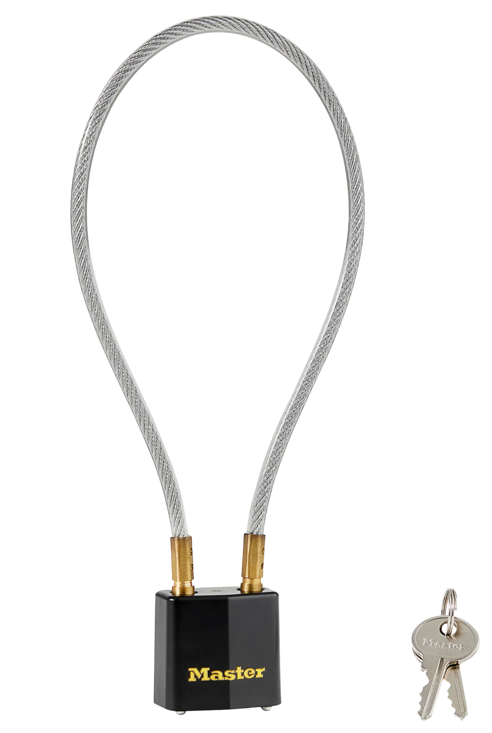The master lock no.99dspt cable gun lock is 14in (35cm) long and is made from braided steel for maximum strength and flexibility.The padlock features a 1-5/16in (33mm) wide laminated steel body for maximum strength and reliability, vinyl covers on lock and cable prevent scratching.Color: Black & GoldMaterial: SteelView more