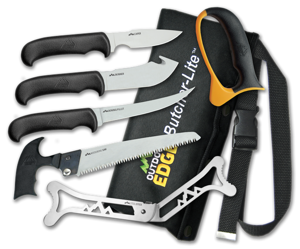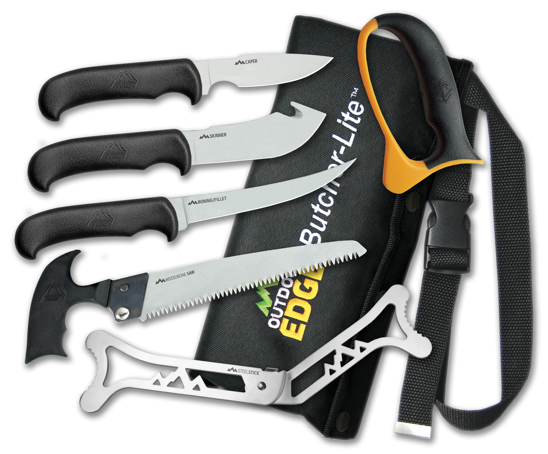 The butcherlite includes every tool to field dress, skin, quarter and debone big game in a nylon roll pack that converts to a belt scabbard to easily access each tool.Includes 4.3" caper blade, 4.5" skinner blade, 5.9" boning blade and a 6" saw blade, tungsten-carbide sharpener, ribcage spreader and a set of game cleaning gloves.Each knife incorporates full-tang construction for superior strength and is taper ground thin and hand finished shaving sharp for superior edge retention and performance.Rubberized tpr handles ensure comfort during long use and provide a safe, non-slip grip even when wet.Features snap-in, removable, knife scabbards for easy cleaning.