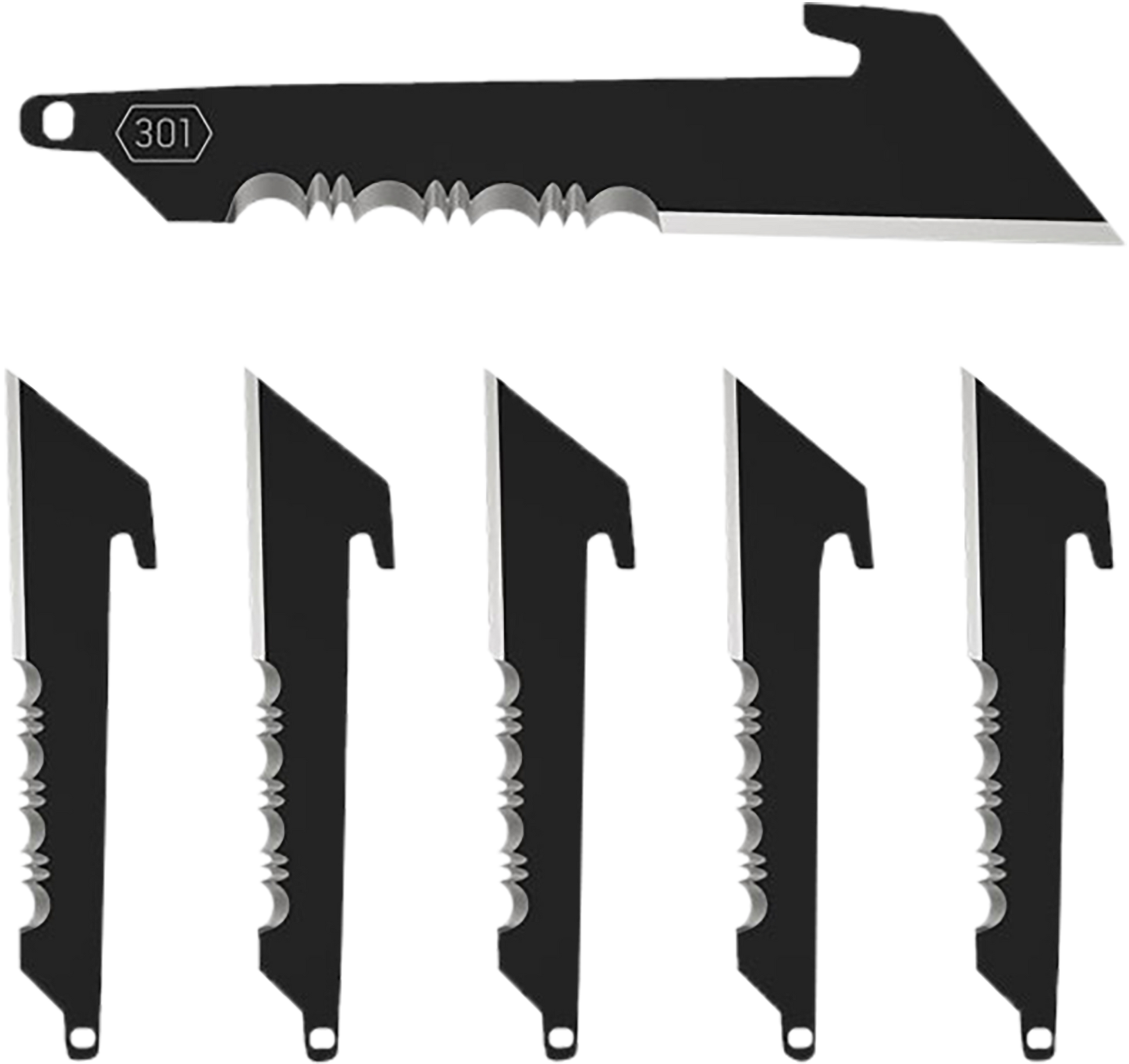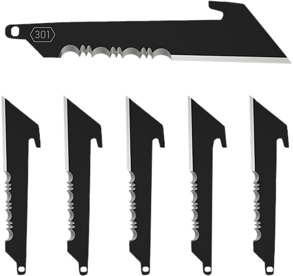 Set of six 3" serrated utility replacement blades.Perfect for hunting, work and everyday carry.Each blade comes sealed in a plastic pouch with pvc blade cover to protect the blade from the elements and to improve safety when transporting and changing blades.View more