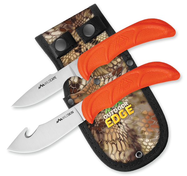 The outdoor edge wildpair is a lightweight hunter combo with two great knives to get the job done fast.The deep-bellied gut-hook skinner opens game like a zipper and the caping knife performs intricate cuts with surgical sharp precision.Its blaze-orange tpr handles with elk horn inlay ensure a safe, non-slip grip, even when wet and never get lost.This value priced combo comes complete with a mossy oak nylon belt sheath.