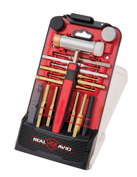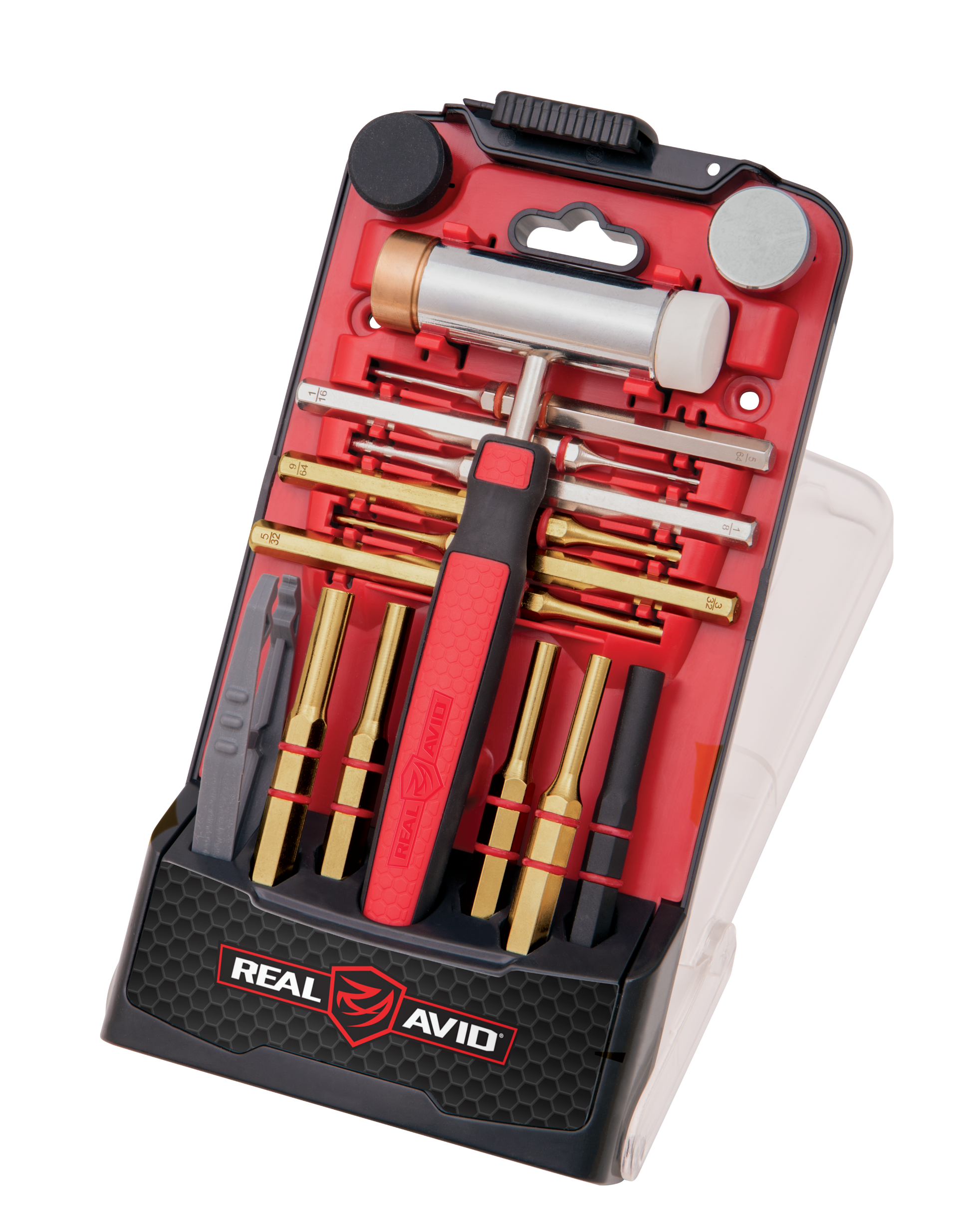 This advanced kit works to safely remove and install gun pins.The ergonomic and perfectly balanced hammer partners with easy grip hex-handle punches for precise control.Hammer & pin punch set includes 4 interchangeable hammer heads: rubber, brass, steel and nylon; gunsmithing hammer with rubberized, ergonomic grip; stand-up case; steel punches: 1/16", 5/64", 3/32";brass punches: 1/8", 9/64", 5/32", 3/16", 7/32", 1/4", 9/32'; non-marring finishing punch and pin alignment tool.