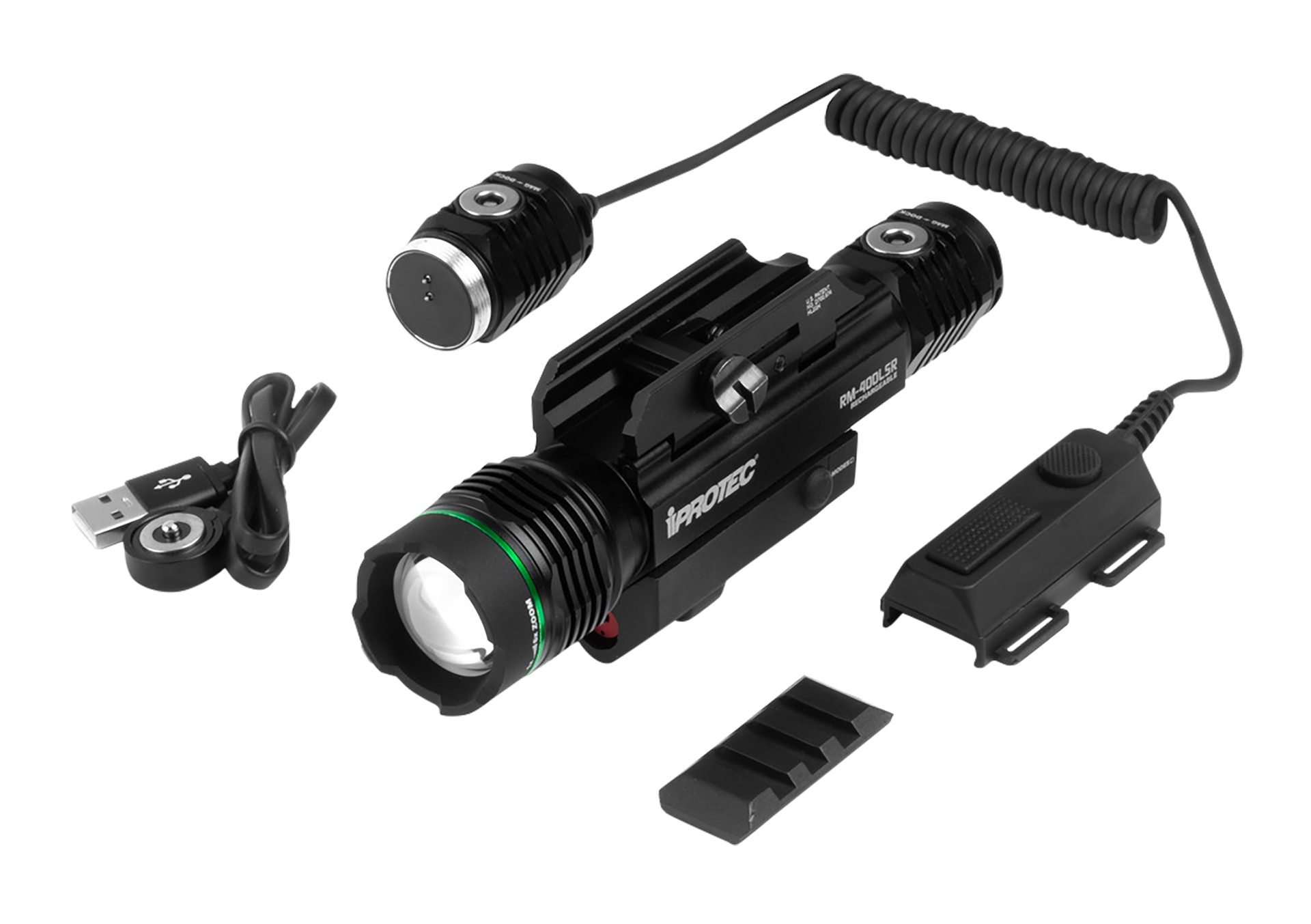 The rm400lsr is a rechargeable light and laser combo designed specifically for rail-mount equipped firearms.The rm400lsr features 400 lumens of green light, 6x adjustable zoom and a sightable red laser.The three green light modes, low/high/strobe are controlled with the dual-mode pressure switch or the standard flashlight end cap.The rm400lsr is mag-dock usb rechargeable; adjusts, tightens and locks without tools and uses a patented universal rail mount with an added rail-mount for attaching additional accessories.Includes 18650 lithium ion rechargeable battery, universal mount, dual-mode pressure switch and mag-dock usb charging cable.
