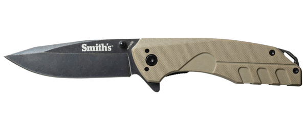 Smith's battleplan 3.35" drop point blade features a black stonewash finish that provides extra protection while providing a rugged look.The razor sharp blade made of precision heat treated 400 series stainless steel with a flipper and an ambidextrous thumb screw for easy opening and equipped with ball bearing pivot.The handles are a rugged custom g10 material and sturdy liner lock design secures the blade open during use.The battleplan includes a reversible pocket clip.