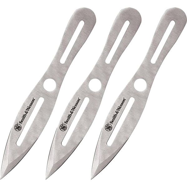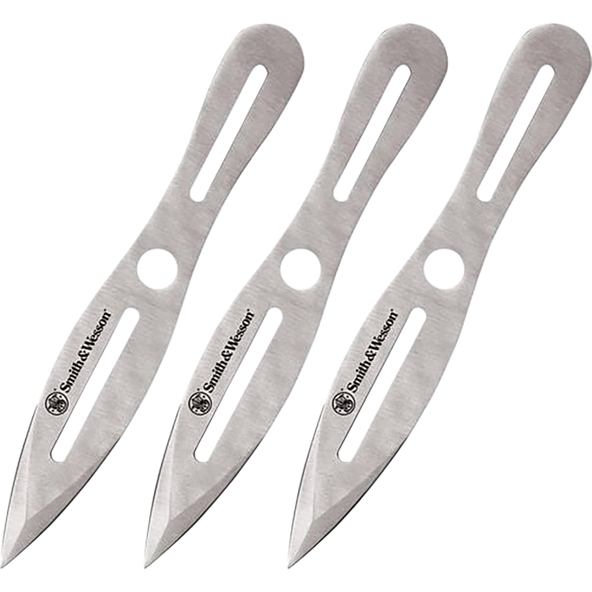 The smith & wesson 10" throwing knives are made from 2cr13 stainless steel and have duel edged spear point blades.This is a pack of three throwing knives and they come with a black nylon belt sheath.Closed Length: N/AType: Throwing KnifeBlade Type: Dual Edge Spear PointBlade Length: 5"Oal: 10"Blade Material: 2Cr13MoV SSHandle Description: 2Cr13 StainlessWeight: 1.32 ozSheath: NylonEdge Type: PlainFrame: Stainless SteelOpen Type: N/ANo. Of Blades:...View more