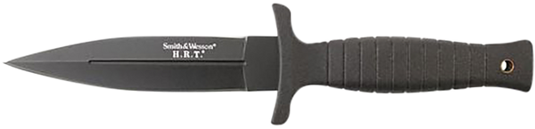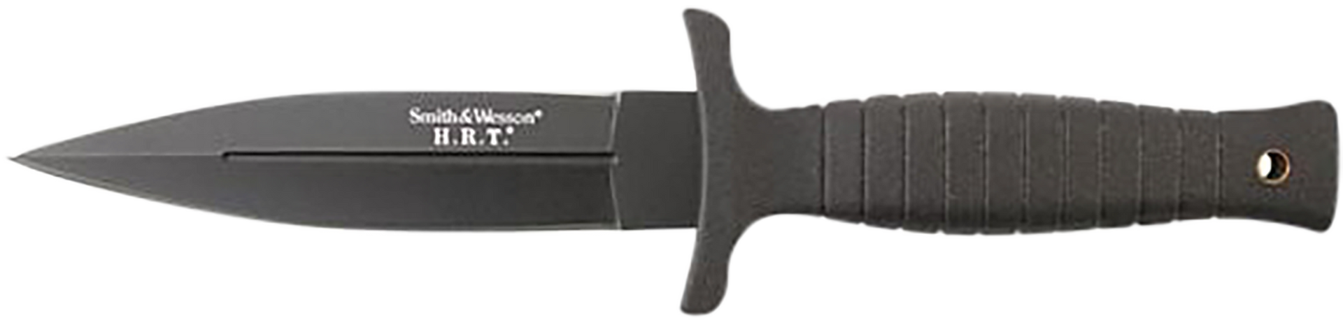 The smith & wesson h.R.T.Full tang fixed blade knife is made out of a black high carbon stainless-steel dual-edged spear point blade with blood grooves.Its tpe rubber wrapped handle comes with lanyard hole and black leather belt/boot sheath; note: does not sell in ca, ny, ma.