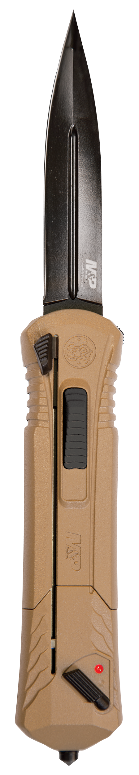 M&p otf spear point with glass breaker.Includes pocket clip.Blade Type: Spear PointBlade Length: 3.50"Oal: 8.66"Blade Material: AUS-8A SSHandle Description: Flat Dark EarthEdge Type: PlainOpen Type: Spring AssistView more