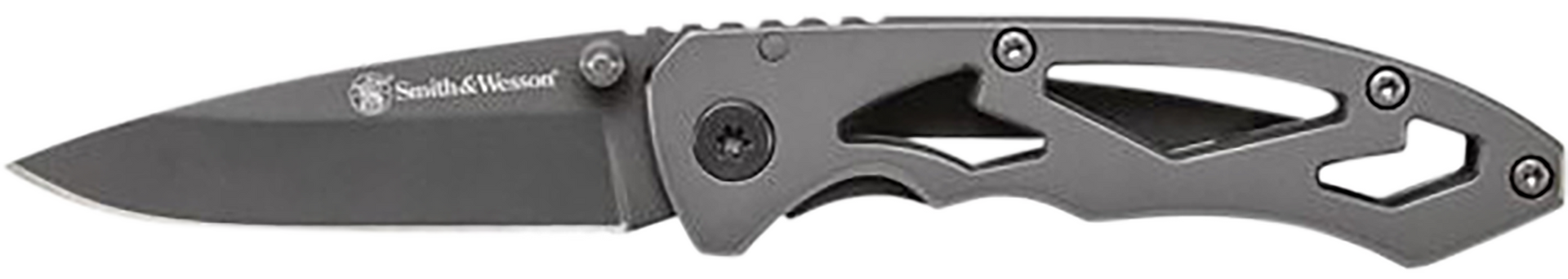 Drop point silver skeletonized knife with a stainless steel handle, high carbon stainless steel blade.Includes pocket clip.