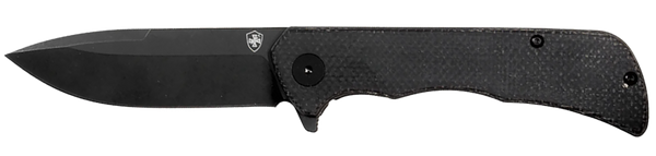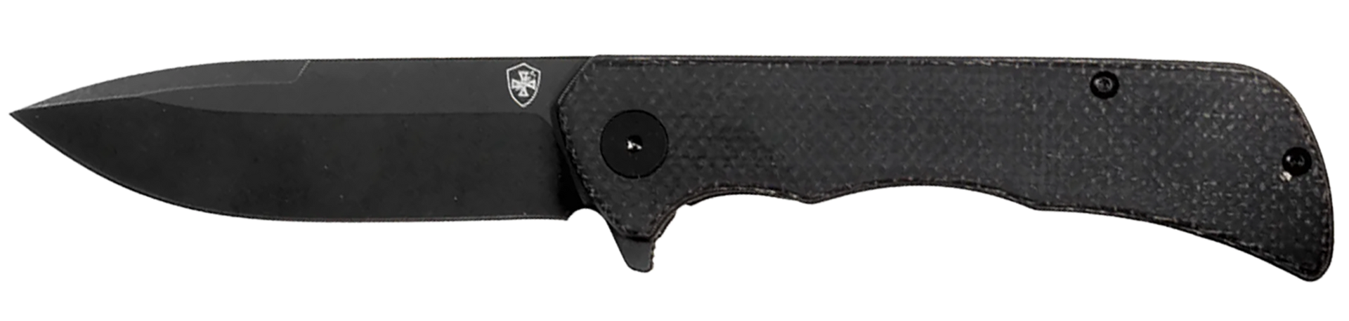 Paladin linerlock folder features a black powder coated d2 steel blade and a micarta handle.Includes pocket clip.