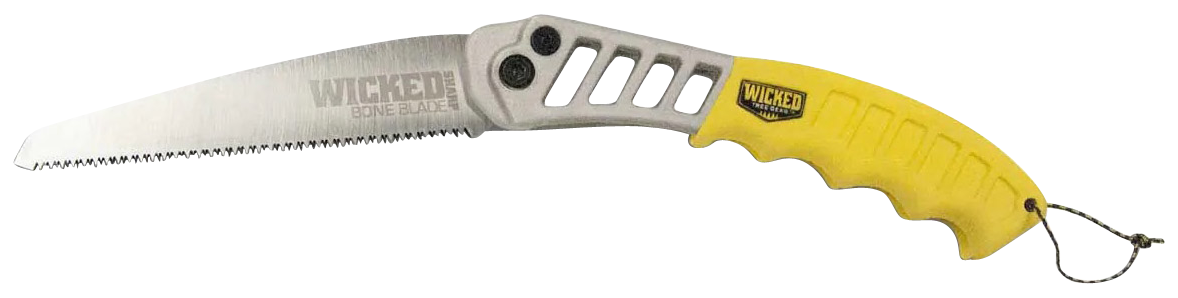 Wicked tough utility/bone saw features rugged cast aluminum handle construction; high carbon steel blade, taper ground, heavy gauge resists bending and breaking; non-slip rubber ergonomic, over-mold grip and a fail safe blade lock design with hardened steel lock-pin and hardware.