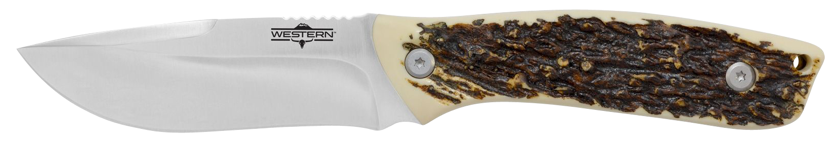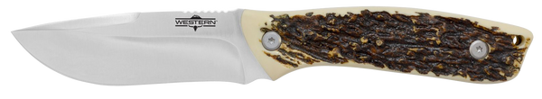 The western crosstrail fixed blade knife strikes a balance between its stylized aesthetic and functional capabilities.Featuring a 4.25" titanium bonded 420 steel blade bonded with titanium this adds extra resistance to rust and corrosion while also making the blade up to 3x harder than untreated steel.The extra hardness affords edge retention as well.The handle is made of delrin, an extremely durable and stable crystalline plastic used to resemble stag or antler.Includes a sheath and belt loop.