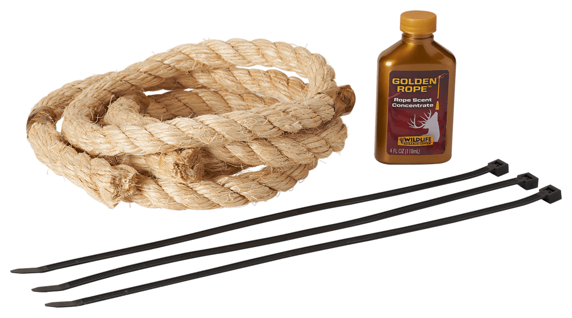 Kit comes in a convenient wide mouth resealable container to hold rope scent to easily dip and re-dip the end of the rope in after it is set up.Kit includes 3-30" scent ropes, 4 fl oz golden rope scent concentrate, 3 cable ties, & resealable container for mixing and dipping.