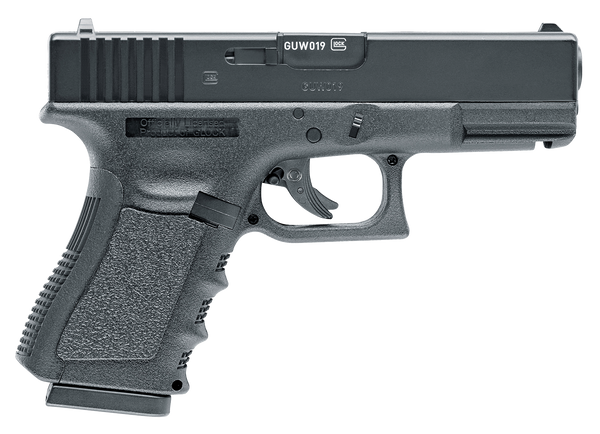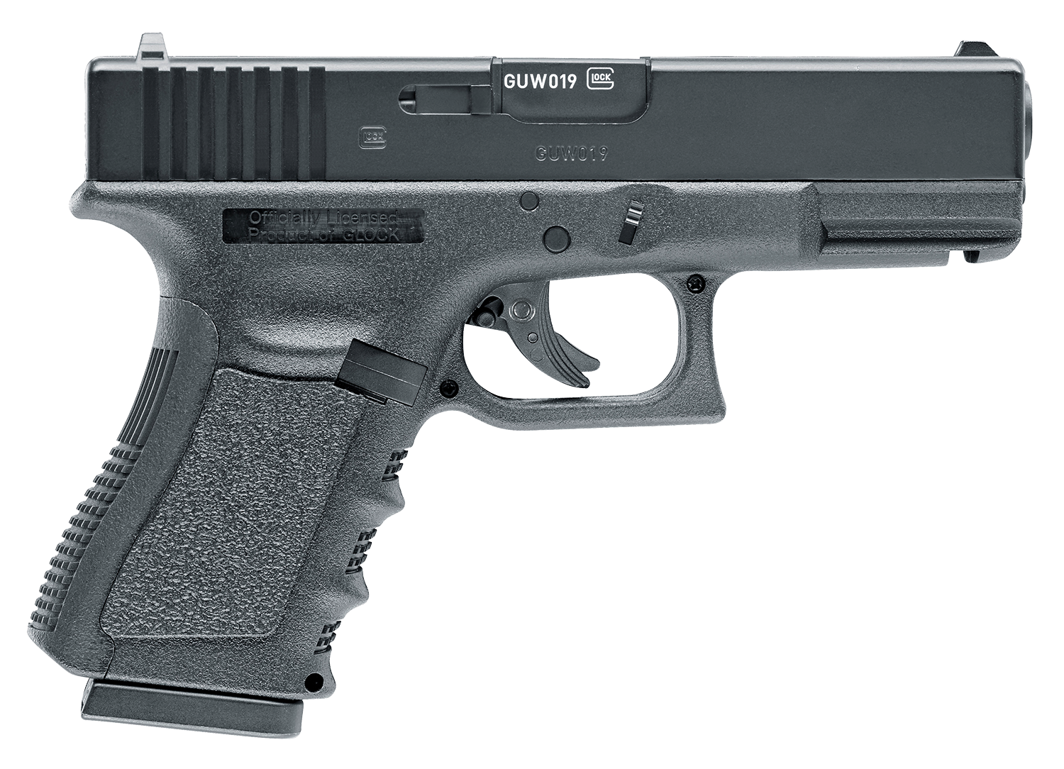 The uma glock 19 is ideal for a more versatile role because of its reduced dimensions.The co2 airgun replica of the glock 19 in.177 caliber is compact and handy with the unmistakable look of the original pistol and plenty of power.This semi-auto repeater model is powered by one 12g co2 capsule, the co2 is housed in the grip and the co2 allen key is integrated into the backstrap.It has a metal slide, fixed glock style sights, integrated weaver rail and a push button safety in the trigger.