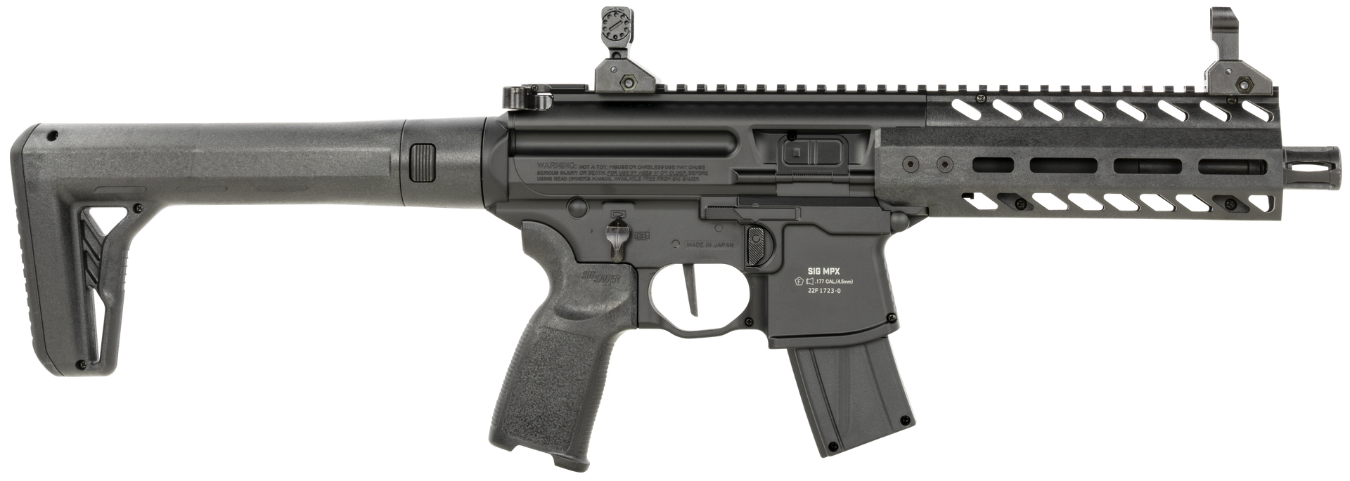 The sig mpx redefined modern pistol caliber sbrs, and this air rifle version does no less for co2 rifles.Matched to original model weight, balance, and controls, the sig mpx air rifle puts more accurate performance into more accessible practice.Chambered in.177 pellet, features include an 8" rifled steel barrel, synthetic handguard, picatinny rail, tactical front grip, flip-up front, and rear sights.
