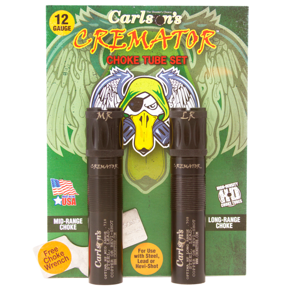 Carlson's cremator choke tubes feature our new triple shot technology and is offered in close mid and long range constrictions.Tst is a series of three graduated rings in the taper section of the choke tube, that allow a more gradual transition from the shotgun bore to the final constriction.The cremator offers reduced pellet deformation, less flyers, more dense patterns, wrench-less installation, quick removal and muzzle protection.Made in the usa.*note- optima hp and remington pro bore long range cannot be used with any steel shot larger than #2.