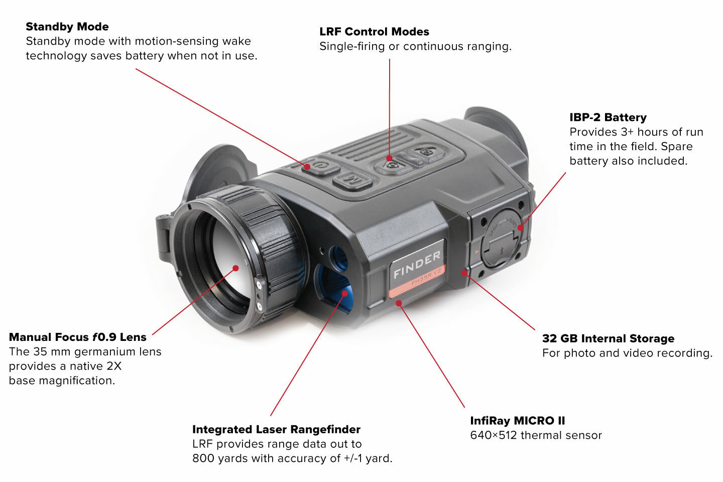 The InfiRay Outdoor FINDER V2 combines a powerful thermal viewer with a handheld laser rangefinder, giving hunters the ability to identify targets at night and accurately determine their range. A 640×512 thermal sensor paired with a 3× 35 mm f/0.9 lens provides a crisp image with ample room for digital zoom, ideal for viewing wildlife or recording photos and videos. The FINDER V2 pairs 800-yard infrared laser rangefinding capability (continuous or single capture) with a 1,750-yard thermal detection range in a compact unit that fits in the palm of your hand. The FINDER V2 ships with two IBP-2 batteries, each providing 3+ hours of run time. A proximity sensor automatically powers off the display when moved away from the viewer’s eye to reduce power consumption and visible light signature.