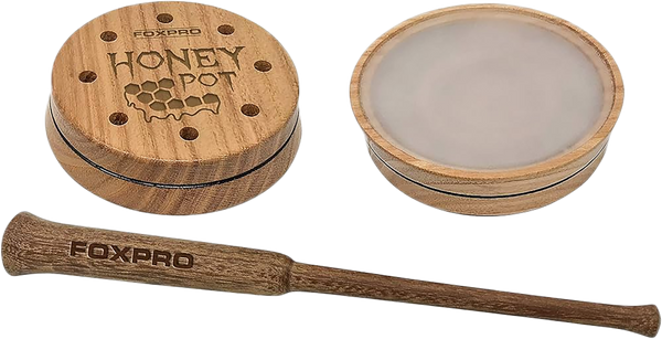 The honey pot is capable of superior sound quality, volume, and realism.It is made from honey locust wood, comes with a one-piece ipe wood striker.The honey pot features a glass tone board underneath the calling surface.This pot call is able to produce soft and subtle purrs, putts and tree yelps, yet still offers incredible volume for cuts, clucks and loud yelps to locate gobblers.The call also features sound ports on the back for increased volume and sound projection.