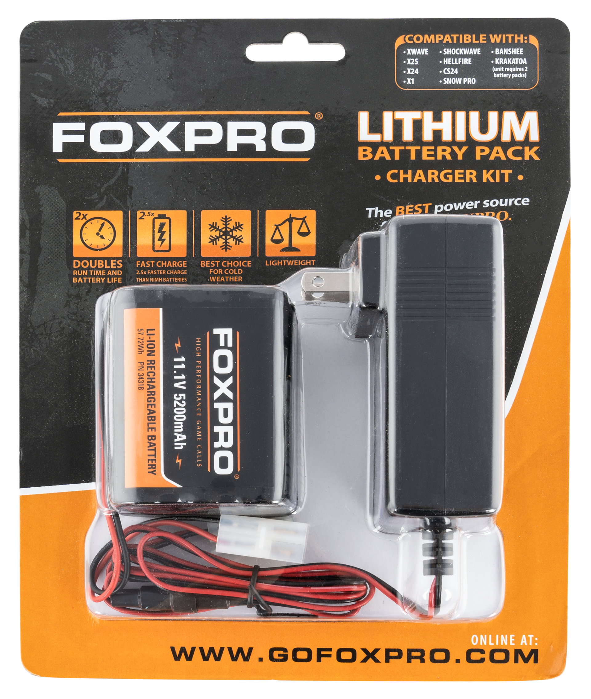 Foxpro rechargeable lithium battery pack comes with a 120v ac fast wall charger.Compatible with the models: shockwave, banshee, screaming-banshee, cs24c, cs24b, cs24, hellfire, krakatoa, krakatoa-ii, snow commando, xwave, x1, x2s, x24, snow pro.