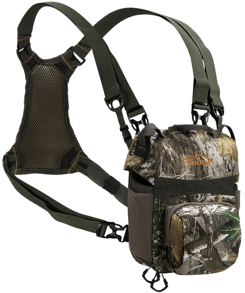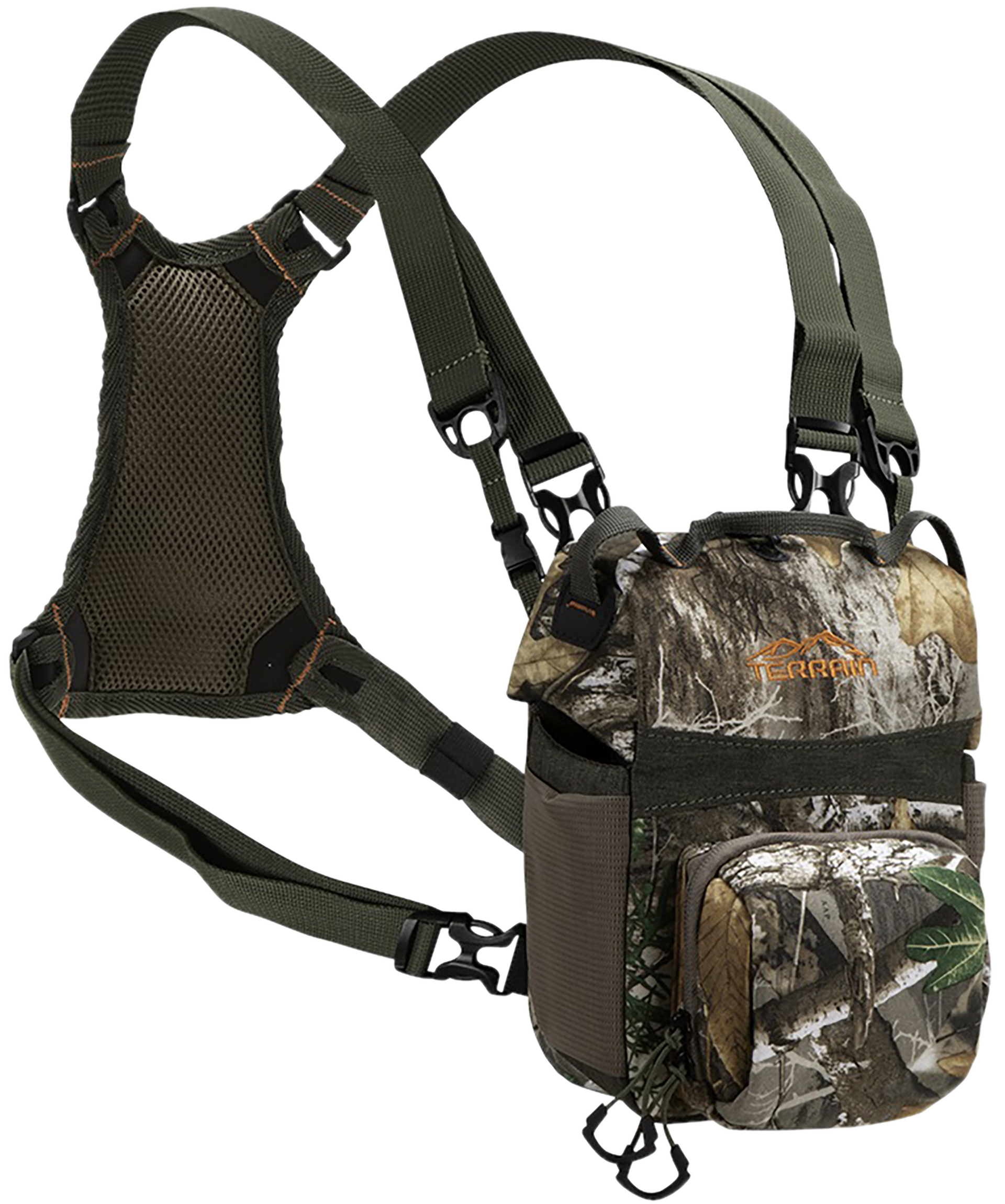 The terrain mesa deluxe bino pack features an easy open, silent magnetic flap for the main bino compartment and has an added clip for secure closure.It also has a comfortable back harness panel with front and back webbing adjustments, mesh back with zippered pocket, two side stretch mesh pockets and a soft interior with a top open pocket.There's also a zippered rangerfinder pocket.