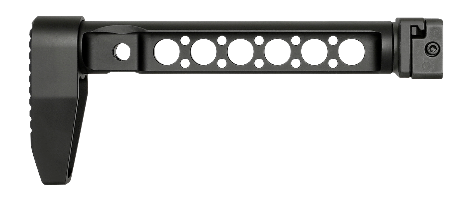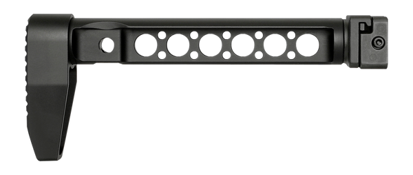 Heavy-duty side-folding mechanism constructed from 4140 steel.Full-length locking lug for maximum strength.Solid positive lock up in both positions.Steel clamp with large surface engagement.Can be configured to right or left folding.Modular design can accommodate different butt plate attachments.Features a skeletonized modular body.Includes 3 anti-rotation qd swivel sockets.Includes aluminum minimalistic butt plate (mi-stap-csp) - 3.75" tall.Adds 8.75 inches to firearm length in the open position.Adds 0.75 inches to the firearm in the folded position.Complete assembly weight: 15.9 oz.Steel parts are mag phosphate finished