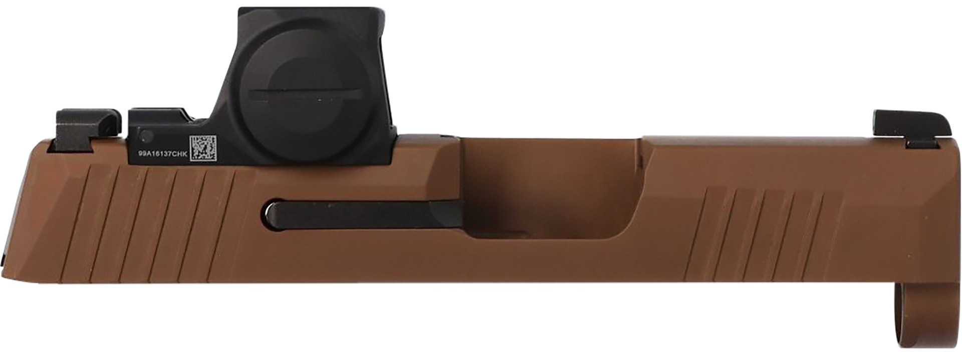 Enjoy using a slide-mounted reflex sight without needing suppressor height iron sights.The factory-installed romeo-x compact optic sits incredibly low to the slide to enjoy co-witness with the included standard height iron sights, giving you a consistent, familiar sight picture.Factory replacement 3.1" 9mm slide for the p365x.Compatible with all p365 9mm models and configurations with the following accompanying items: p365/p365x 3.1" barrel, and recoil assembly.