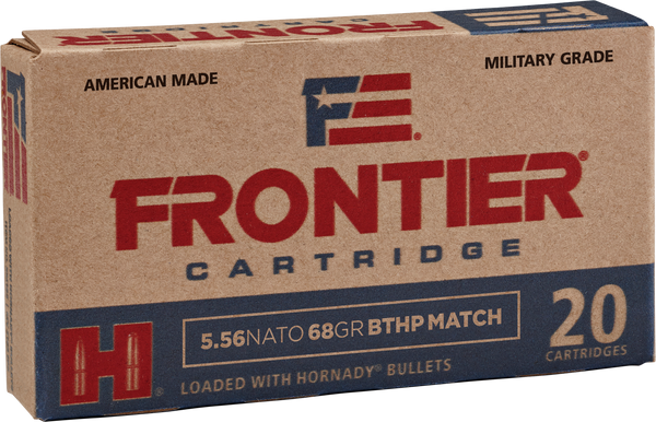 American made and military grade are the hallmarks of frontier cartridge.This line of ammo gives shooters the best of both worlds.It is configured for a wide range of shooters and applications, from target/match shooting to varmint hunting.Frontier cartridge features brass cartridge cases and military grade boxer primers and propellant.Caliber: 5.56x45mm NATOBullet Type: Hollow Point Boat Tail MatchBullet Weight: 68 grMuzzle Energy: 1323 ft lbsMuzzle Velocity:...View more