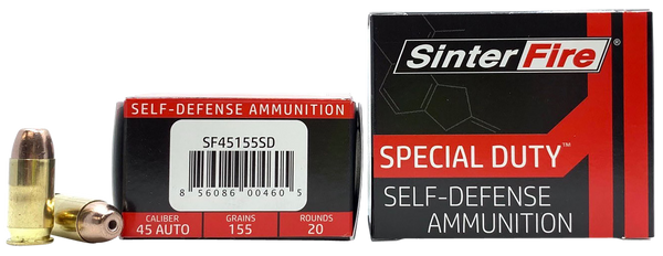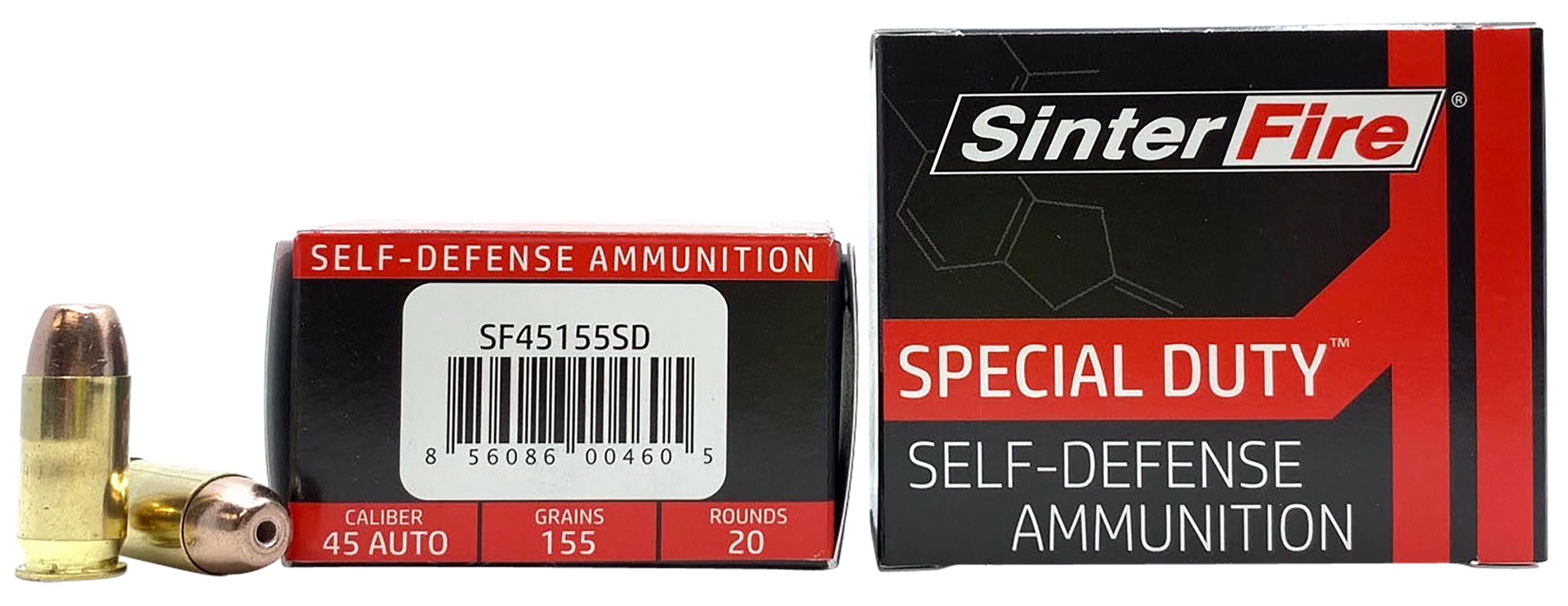 Sinterfire ammunition is designed to increase safety and minimize the environmental concerns from lead.The ammunition is loaded with sinterfire projectiles according to the specific product line of choice.The special duty line features lead free frangible hollow point projectile and is ideal for self-defense.