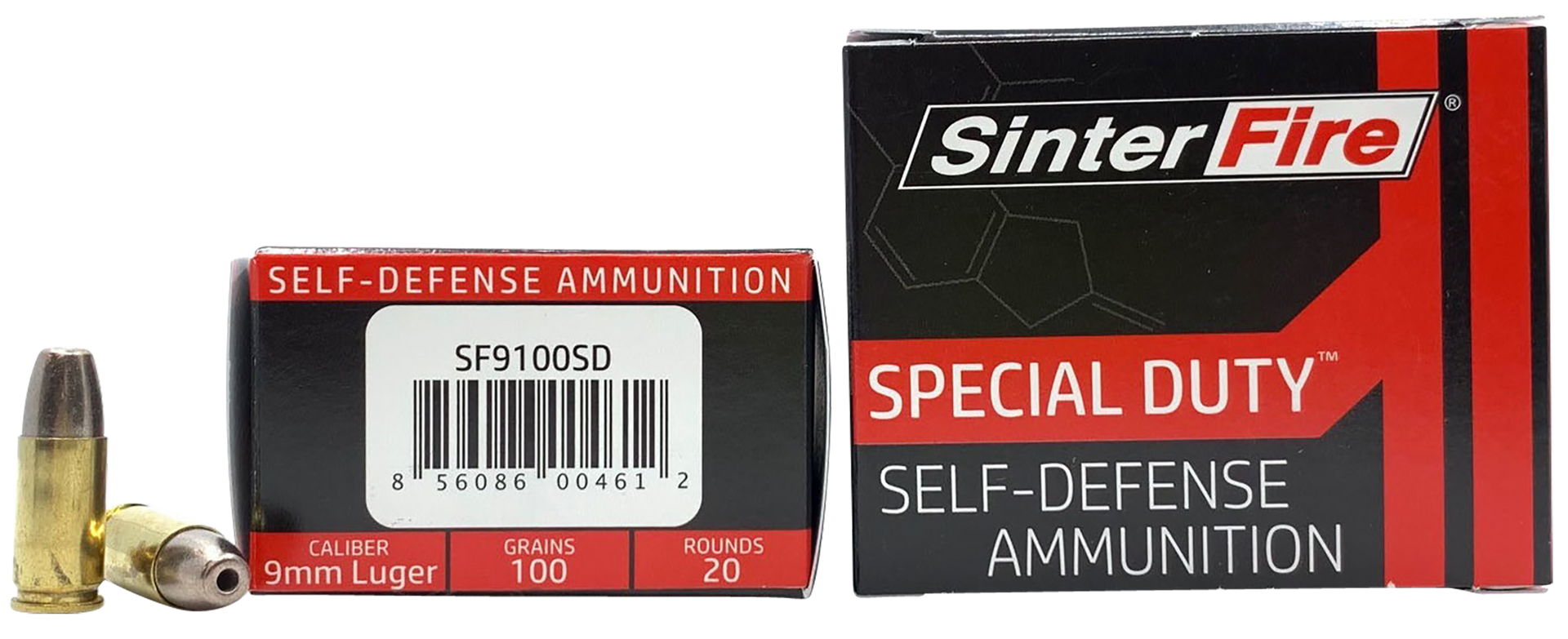 Sinterfire ammunition is designed to increase safety and minimize the environmental concerns from lead.The ammunition is loaded with sinterfire projectiles according to the specific product line of choice.The special duty line features lead free frangible hollow point projectile and is ideal for self-defense.