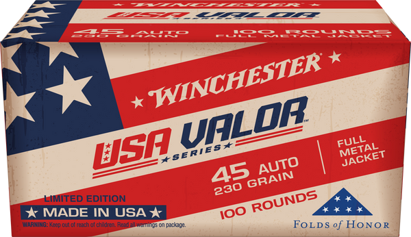 Winchester celebrates its commitment to american freedom with the usa valor ammunition series.From world war i through modern day deployments, winchester remains steadfast in its support of u.S.Warfighters as the largest small caliber enterprise in the world.Winchester's usa valor series helps support a u.S.Veteran's cause that can be found at winchester.Com/usavalor.Caliber: 45 ACPBullet Type: Full Metal JacketBullet Weight: 230 grMuzzle Energy: 356 ft lbsMuzzle Velocity:...View more