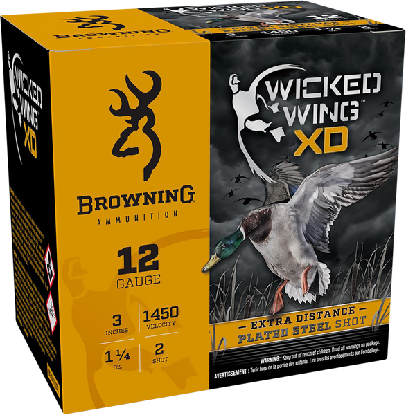 The wicked wing xd extra distance features a high velocity that reduces lead and allows for maximum downrange energy.Its aerodynamically stabilizes wicked wad improves downrange patterns, putting more pellets on target.The premium plated round steel shot is precision sized and shaped to maintain high velocity downrange for deep penetration.Application: HuntingGauge: 12 GaugeType: SteelLength: 3"Ounces: 1 1/4 ozShot Size: 2Muzzle Velocity: 1450 fpsRounds Per Box: 25Boxes...View more