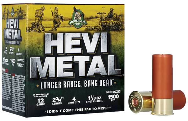 Driven by pattern density technology, hevi-metal longer range is all about more pellets on target at longer range.It features a 30% layer of bismuth which is one shot size smaller than the 70% steel.This ensures both layers have equal downrange performance.Application: HuntingGauge: 12 GaugeLength: 2.75"Ounces: 1 1/8 ozShot Size: 4Muzzle Velocity: 1500 fpsRounds Per Box: 25Boxes Per Case: 10Hazair: YesView more