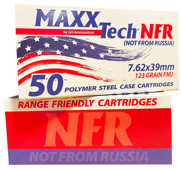 Maxxtech nfr 7.62x39mm rifle, 123 grain polymer coated steel full metal jacket.Caliber: 7.62x39mmBullet Type: Full Metal JacketBullet Weight: 123 grMuzzle Velocity: 2330 fpsRounds Per Box: 50Boxes Per Case: 10Casing Material: SteelHazair: YesView more