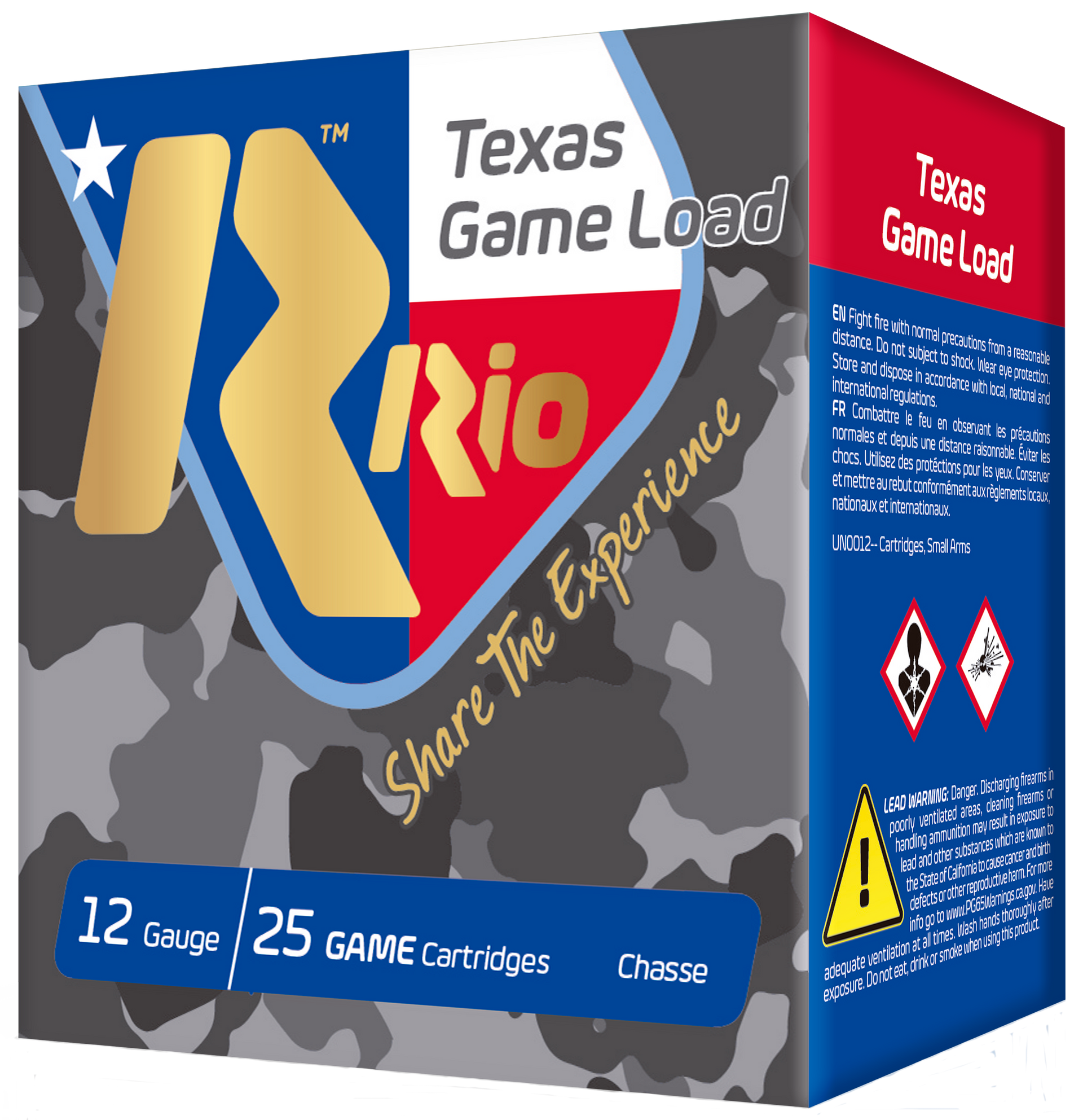 Rio's top game load is offered in a broad line-up of shot sizes, payload weights and velocities.It is a dove specific load for all conditions whether shooting mourning dove up to the high-flying white-wing dove.The texas game load combines high quality, great stopping power, and accuracy into a one-of-a-kind shooting experience.This standard velocity 12 gauge load has an 8 shot size and a muzzle energy of 1250 fps.