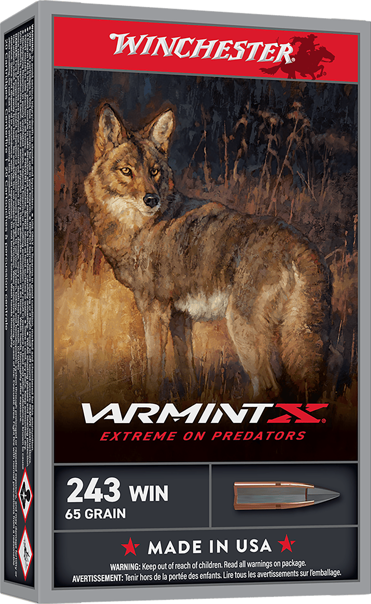 Varmint x is designed specifically for the demands of predator and varmint hunters.The sleek, polymer-tipped bullets are explosive upon impact.It combines the proven dependability winchester is known for with today's latest technology, providing hunters the ammunition of choice for pursuing everything from prairie dogs to coyotes.Caliber: 243 WinBullet Type: Extreme PointBullet Weight: 65 grMuzzle Energy: 1891 ft lbsMuzzle Velocity: 3620 fpsRounds Per Box: 20Boxes Per...View more