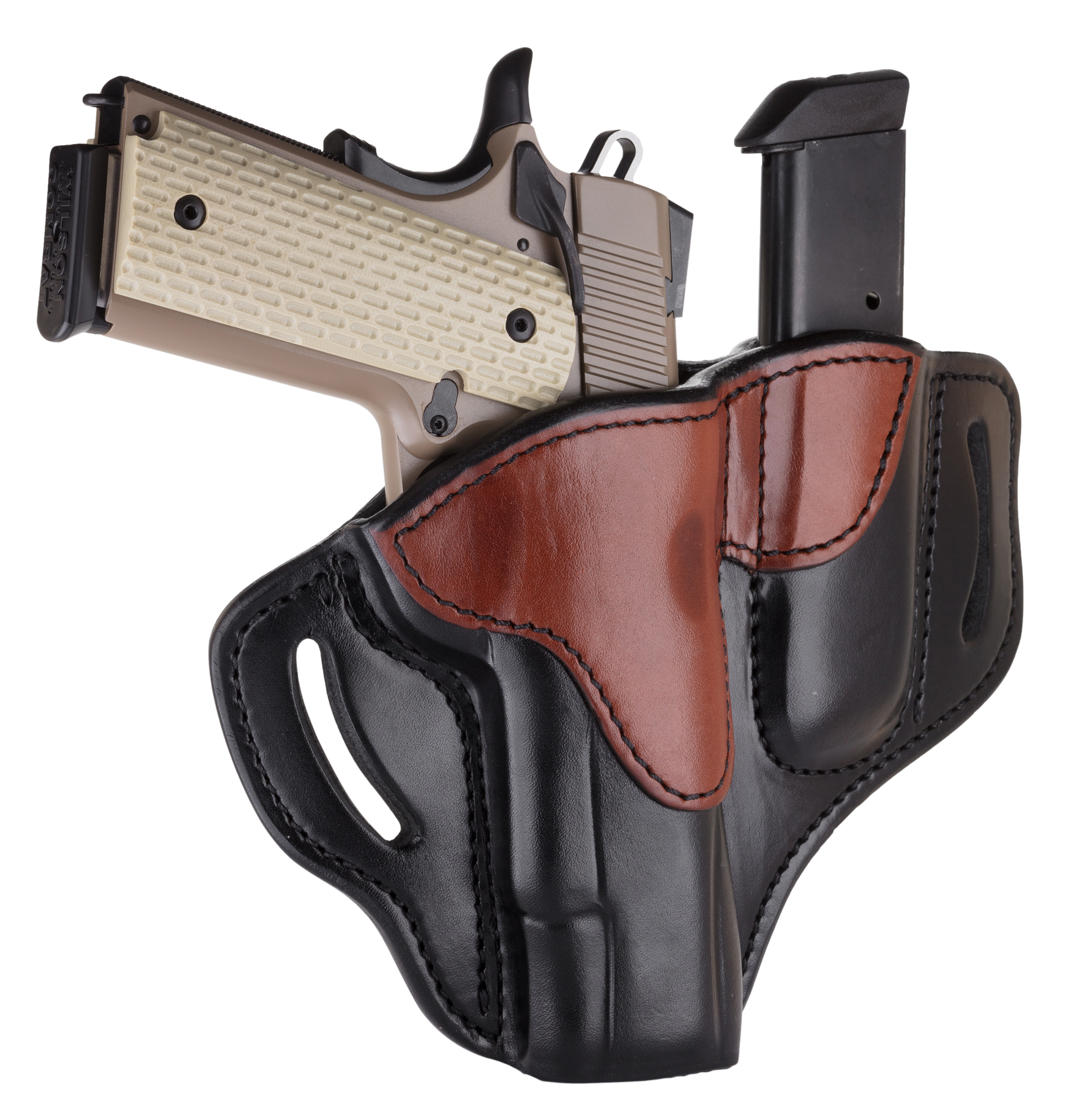 The 1791 gunleather combo 1911 belt holster with mag lets you carry your single-action, semi-automatic pistol, along with one extra 45 caliber magazine.The traditional-looking design makes the combo 1911 belt holster with mag a popular choice among law enforcement and military personnel, as well as everyday patriots.Choose your model, right or left preference, and a classic color to create a customized, handsome housing for your 1911.Compatible with 1911 5"; browning hp; colt 1911 5"; kimber 1911 5", pro tle/rl ii; rock island 1911 5" rock series; ruger sr1911 and similar frames.
